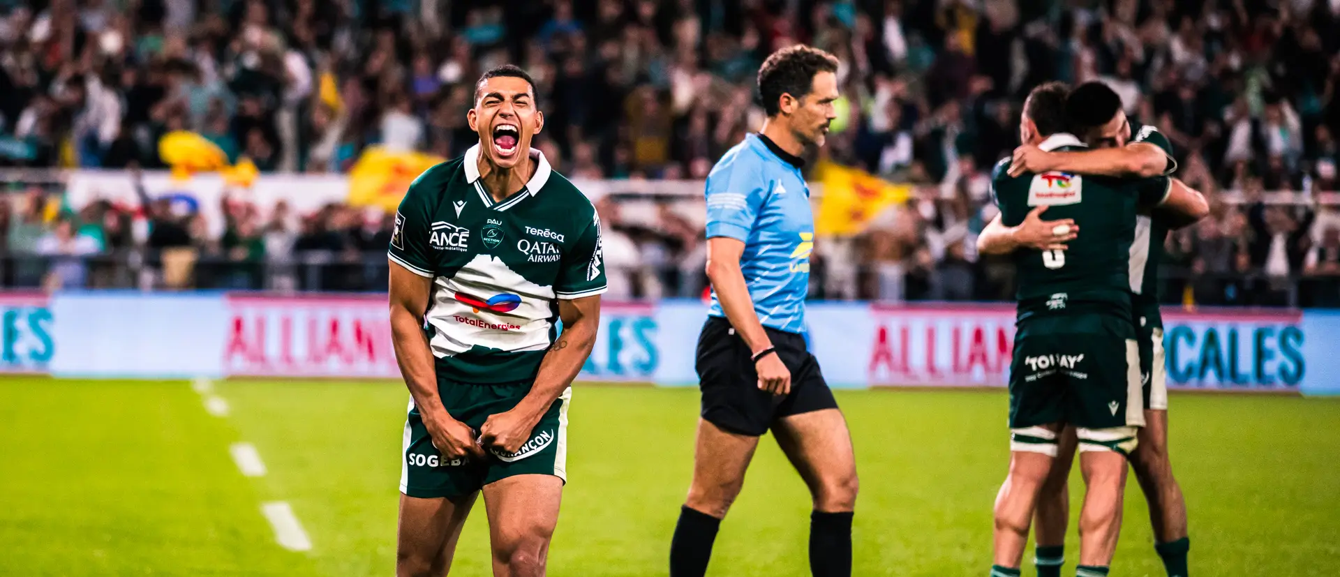 Les Vert et Blanc redoublent d’intensité et recollent Toulouse grâce à un bel essai en coin d’Aaron Grandidier-Nkanang. Avec la transformation de Desperes, Pau n’est plus qu’à 3 longueurs du Stade (49’ 20-23). Notre jeune demi d’ouverture égalise même à la 68e minute (23-23). Le combat est rude mais la Section peut compter sur la fiabilité de sa conquête et la détermination de ses joueurs pour ne rien lâcher. Alors que Toulouse reprend les devants d’un coup de pied de Kinghorn (73’ 23-26), nos Béarnais décident d’aller en touche sur une ultime pénalité. Au match nul, ils préfèrent tenter la pénaltouche pour la victoire. Le ballon porté béarnais avance et termine dans l’en-but ! Jimi Maximin libère le Hameau, Axel Desperes transforme, Victoire 30 à 26 !