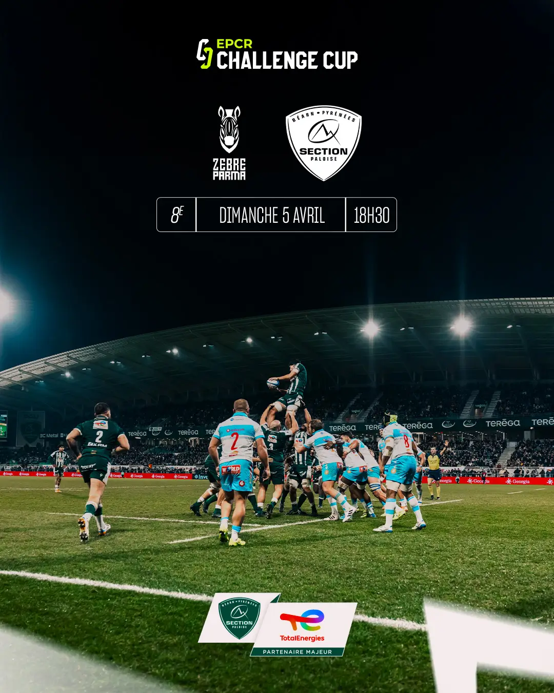 Nos Vert et Blanc disputeront leur 8e de finale d'EPCR Challenge Cup le dimanche 5 avril à 18h30 face à Zebre Parma, en Italie.