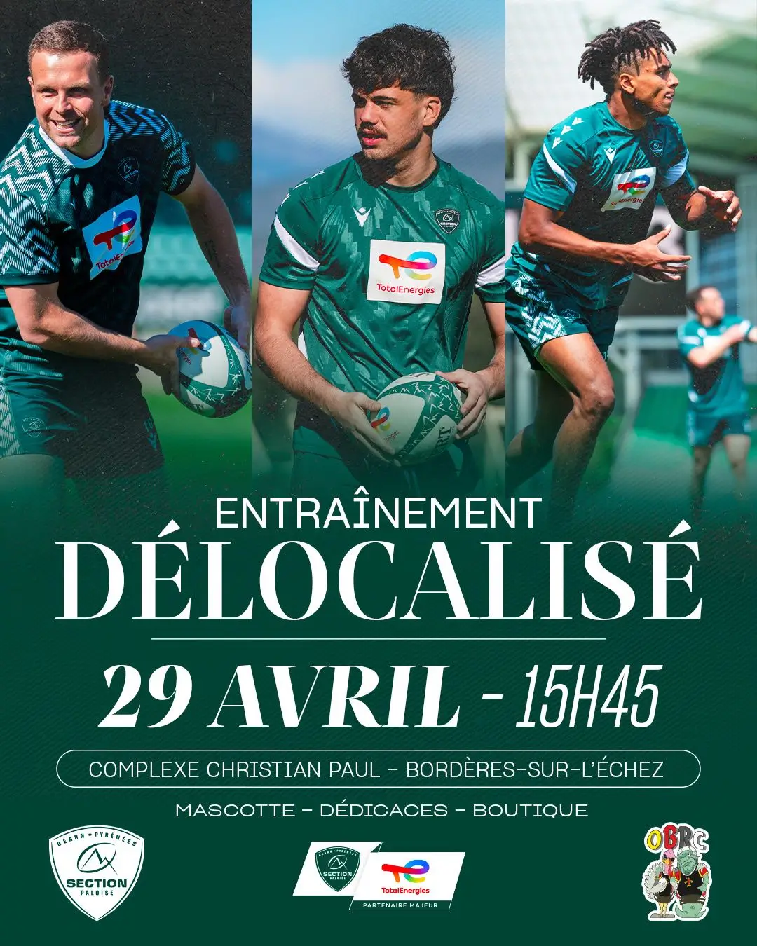 Le mercredi 29 avril à partir de 15h45, le complexe Christian Paul de Bordères-sur-l'Échez et le club de l'OBRC accueilleront nos Béarnais lors d'un entraînement ouvert au public : gratuit et sans inscription !