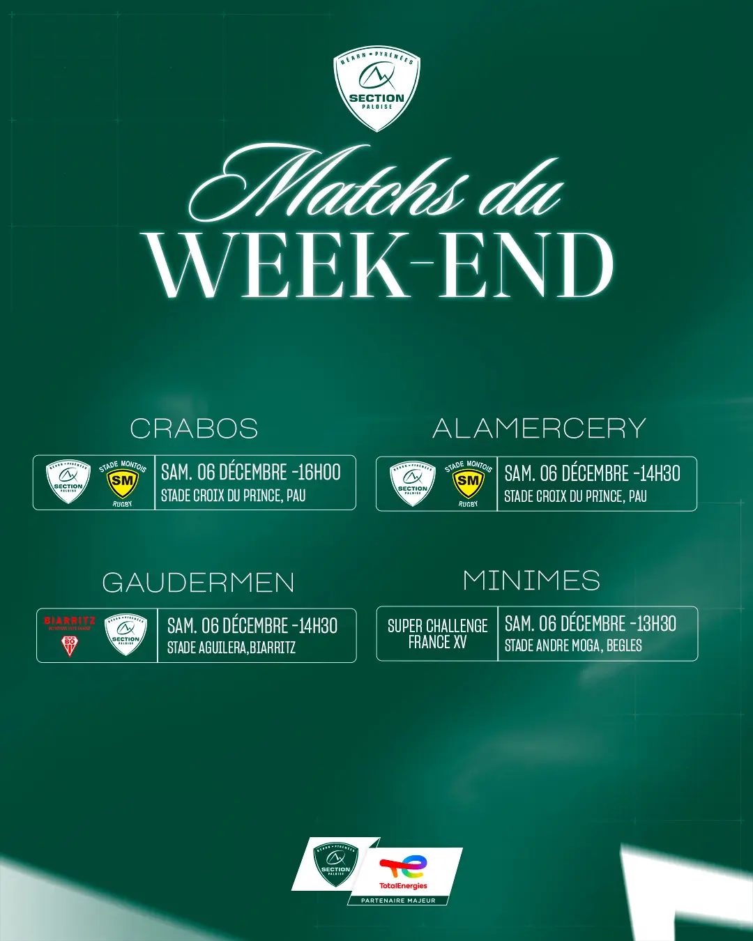 Les Crabos de la Section accueilleront le Stade Montois ce samedi à 16h au stade de la Croix du Prince pour la 7ᵉ journée. Un succès leur permettrait de conserver leur position de leaders.