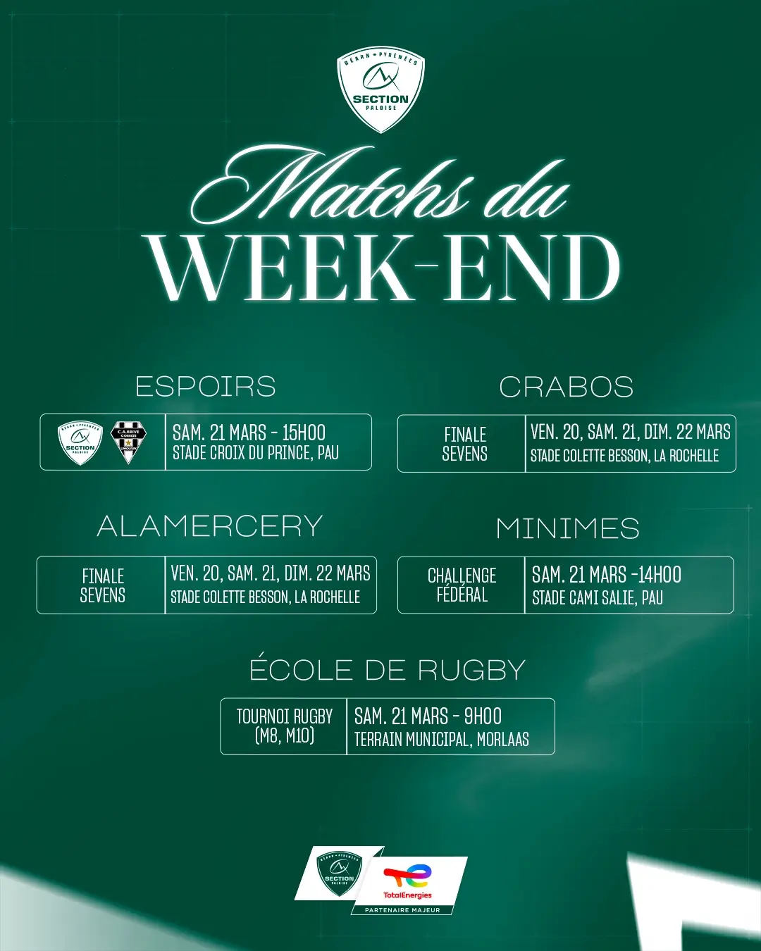 Ce samedi, nos Minimes accueilleront Bizanos, Entente Pouillon Habas Labatut, Côtes Sud Landes 2 au stade Cami Salié de Pau, dans le cadre du challenge fédéral.