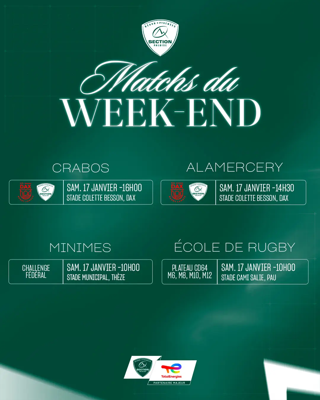 Nos Minimes se rendront au stade municipal de Thèze pour disputer leur Challenge Fédéral, où ils affronteront Porte du Béarn, Bizanos et l’EPY.