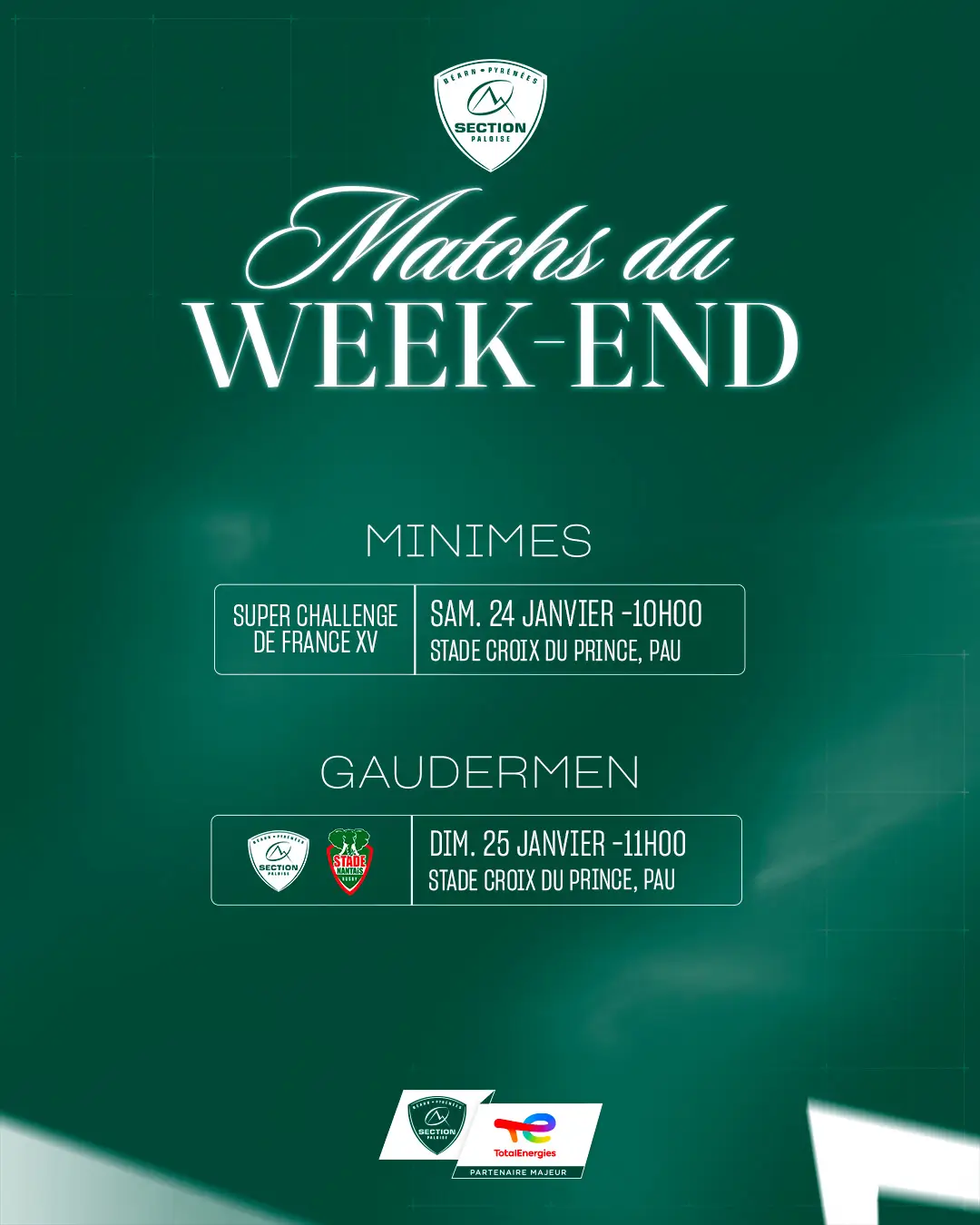 Les Minimes de la Section joueront la 2ᵉ journée de la phase 2 du Super Challenge de France à XV ce samedi à partir de 10h00, au stade de la Croix du Prince à Pau. Ils affronteront Tarbes et Mont-de-Marsan.