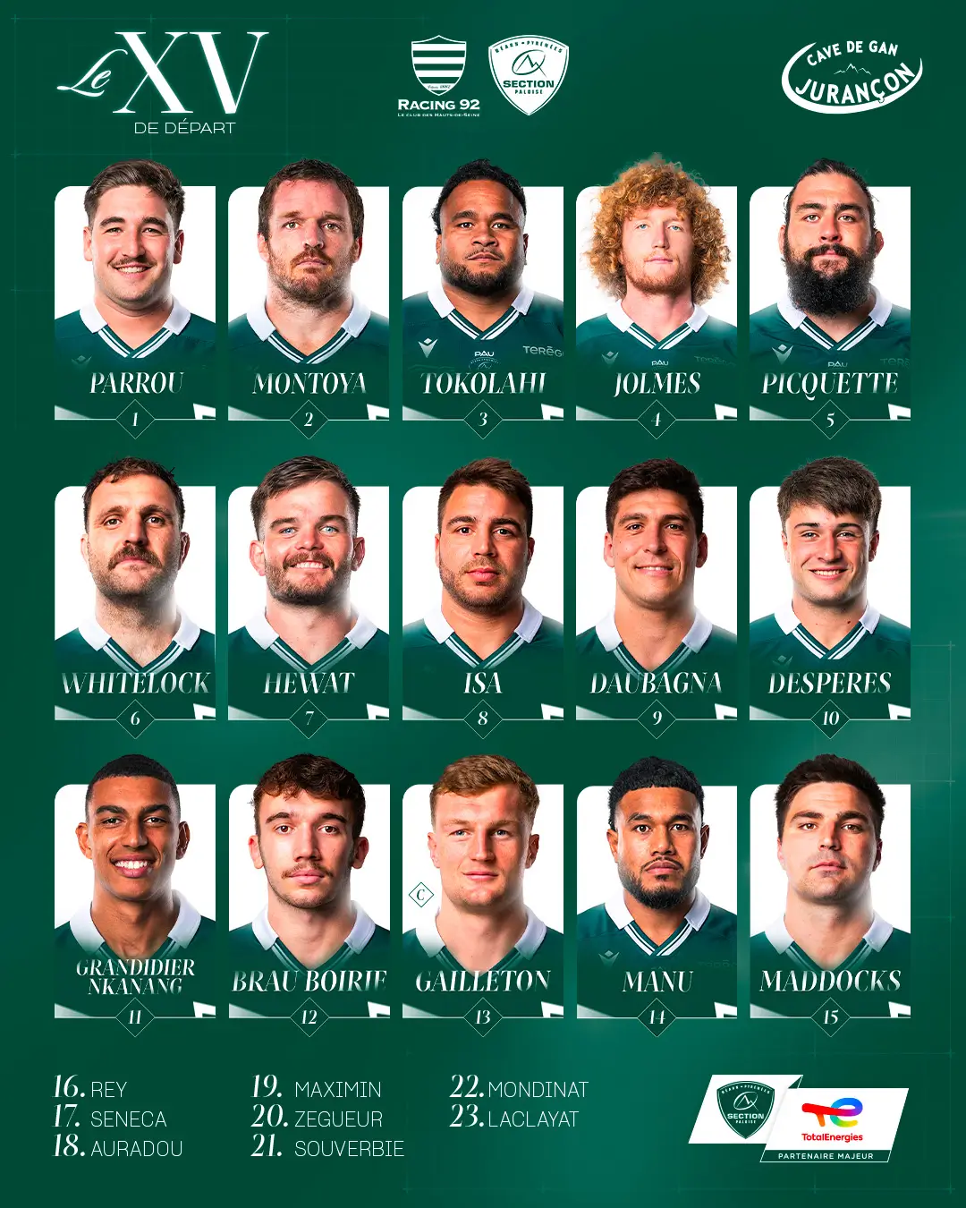 Racing 92 : Prisciantelli - Hulleu, Fickou, Tuisova, Ravutaumada - (o) Seunes, (m) Gibert, Manyarara, Joseph, Baudonne - Taofifenua, Lainault - Kharaishvili, Tarrit, Gogichashvili