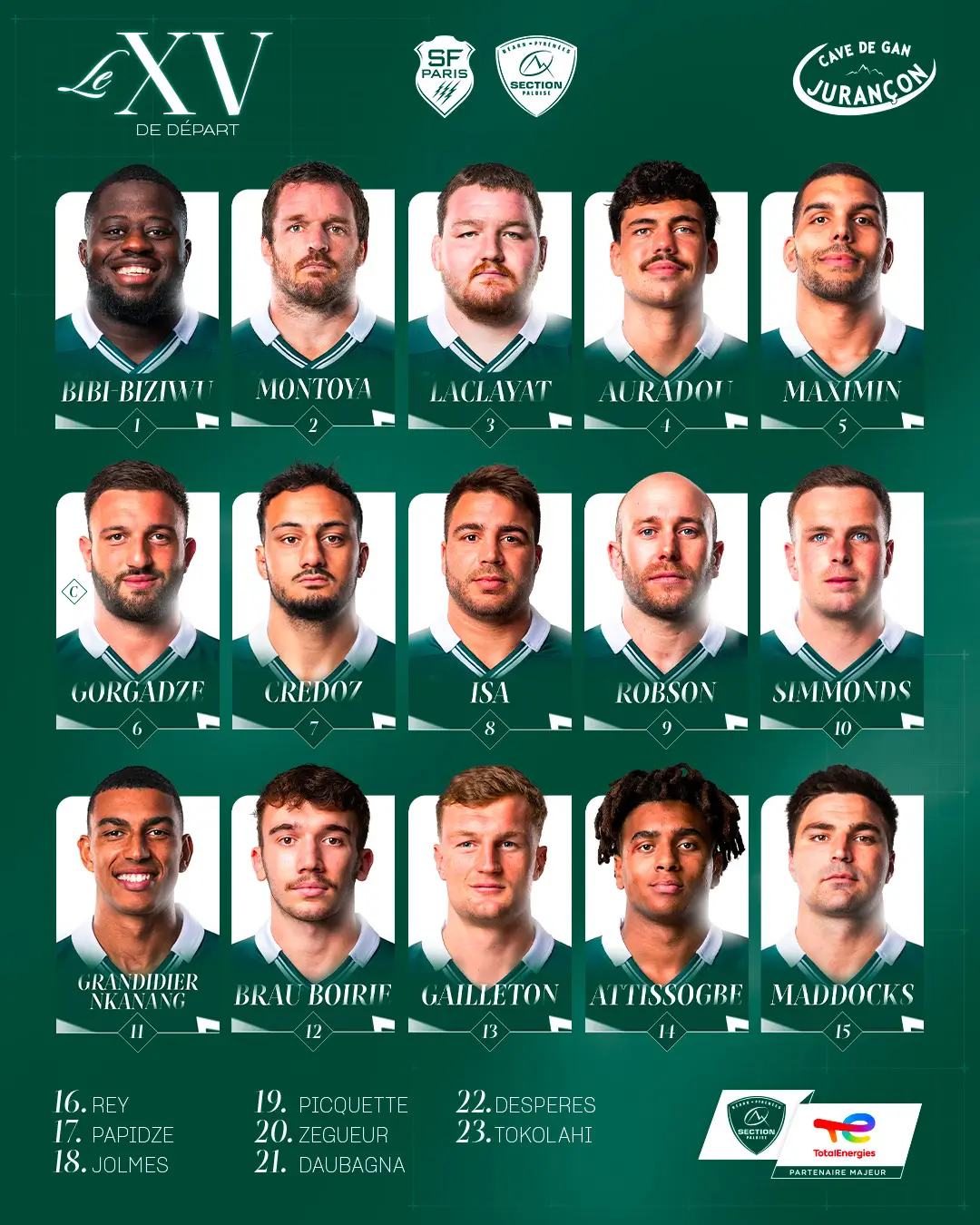 Section : Maddocks - Attissogbe, Gailleton, Brau-Boirie, Grandidier-Nkanang - (o) Simmonds, (m) Robson - Credoz, Isa, Gorgadze (cap) - Maximin, Auradou - Laclayat, Montoya, Bibi-Biziwu