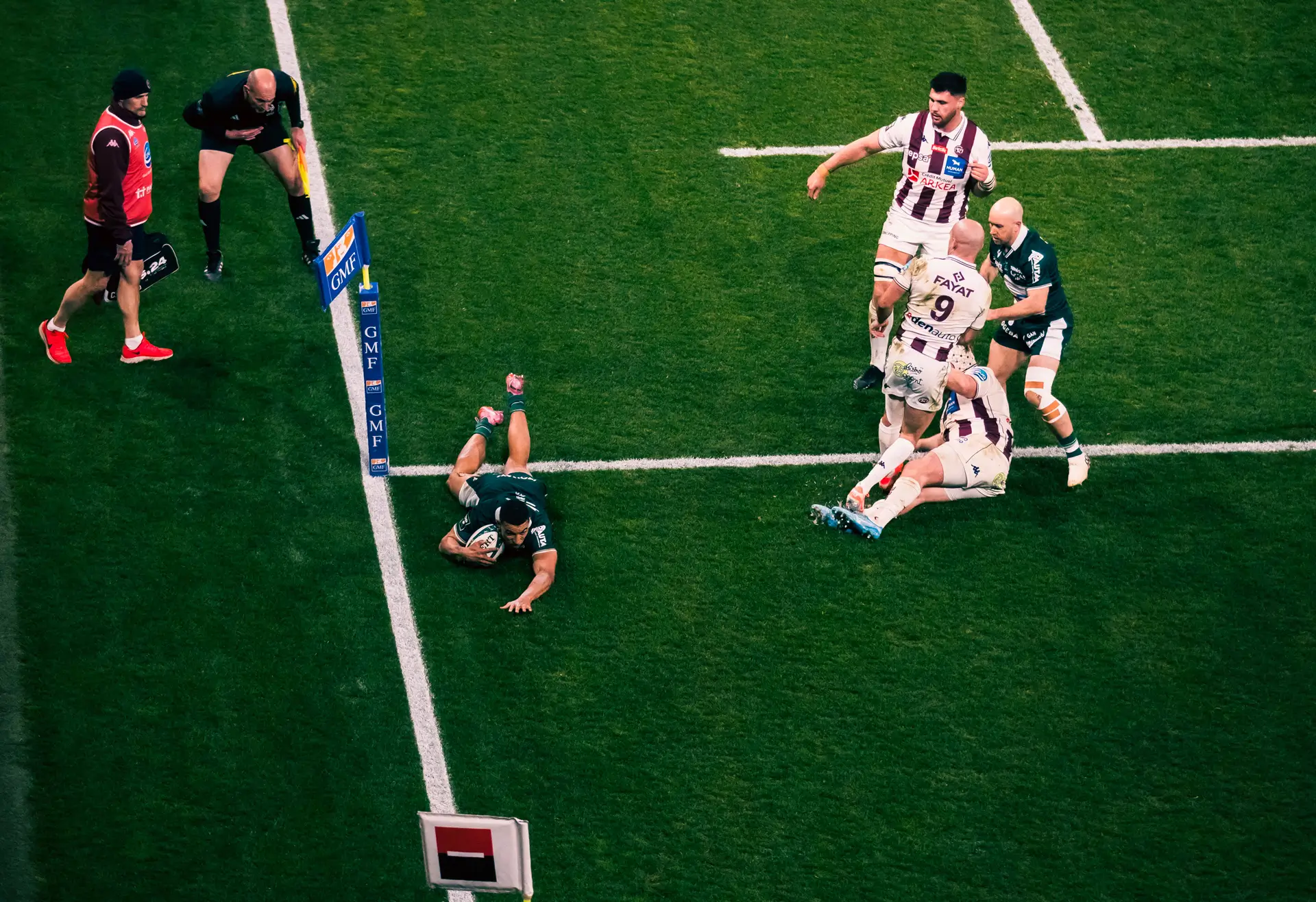 La deuxième période rattaque tambour battant. Le scénario d’un match ultra-serré se confirme sur un essai de Buros qui permet à l’UBB d’égaliser (52’ 17-17). Desperes donne trois supplémentaires aux Vert et Blanc (58’ 20-17) mais rien n’est fait. Aaron Grandidier-Nkanang donne un peu d’air aux Palois avec un essai en bout de ligne (62’ 25-17). Dan Robson s’échappe en coin et surprend la défense bordelaise pour filer à l’essai (67’ 32-17) ! La Section mène alors 32 à 17 et prend une bonne avance à 10 minutes de la fin du match. Parmi les actions du match, comment ne pas citer le cinquième et dernier essai inscrit par Rémi Seneca qui réalise un véritable numéro entre petit pont et sprint en direction de l’en-but (75’ 39-17).