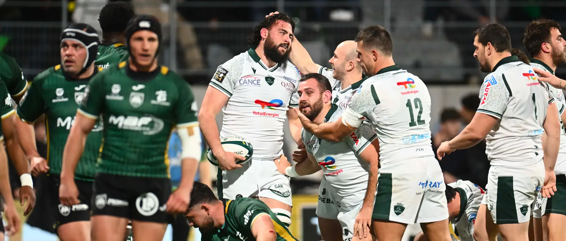 Si les 40 premières minutes ont été assez brouillonnes, les Béarnais vont retrouver leur allant offensif. Grégoire Arfeuil en bout de ligne ramène le score à égalité (45’ 17-17) puis Axel Desperes d’une pénalité redonne l’avantage à la Section (55’ 17-20). En jouant haut dans le terrain, les Vert et Blanc exploitent de bons ballons et scorent à plusieurs reprises : Arfeuil sur turnover (57’ 17-27), Delhommel derrière un maul (68’ 17-34), Decron sur un offload d’Isa (75’ 17-41) et Brau-Boirie pour un doublé final (79’ 17-46 ; 80’ 17-53). En retrouvant des couleurs en deuxième mi-temps, la Section s’offre une troisième victoire à l’extérieur grâce à un jeu d’avants conquérant et des trois-quarts parfaits à la conclusion ou pour créer des occasions.